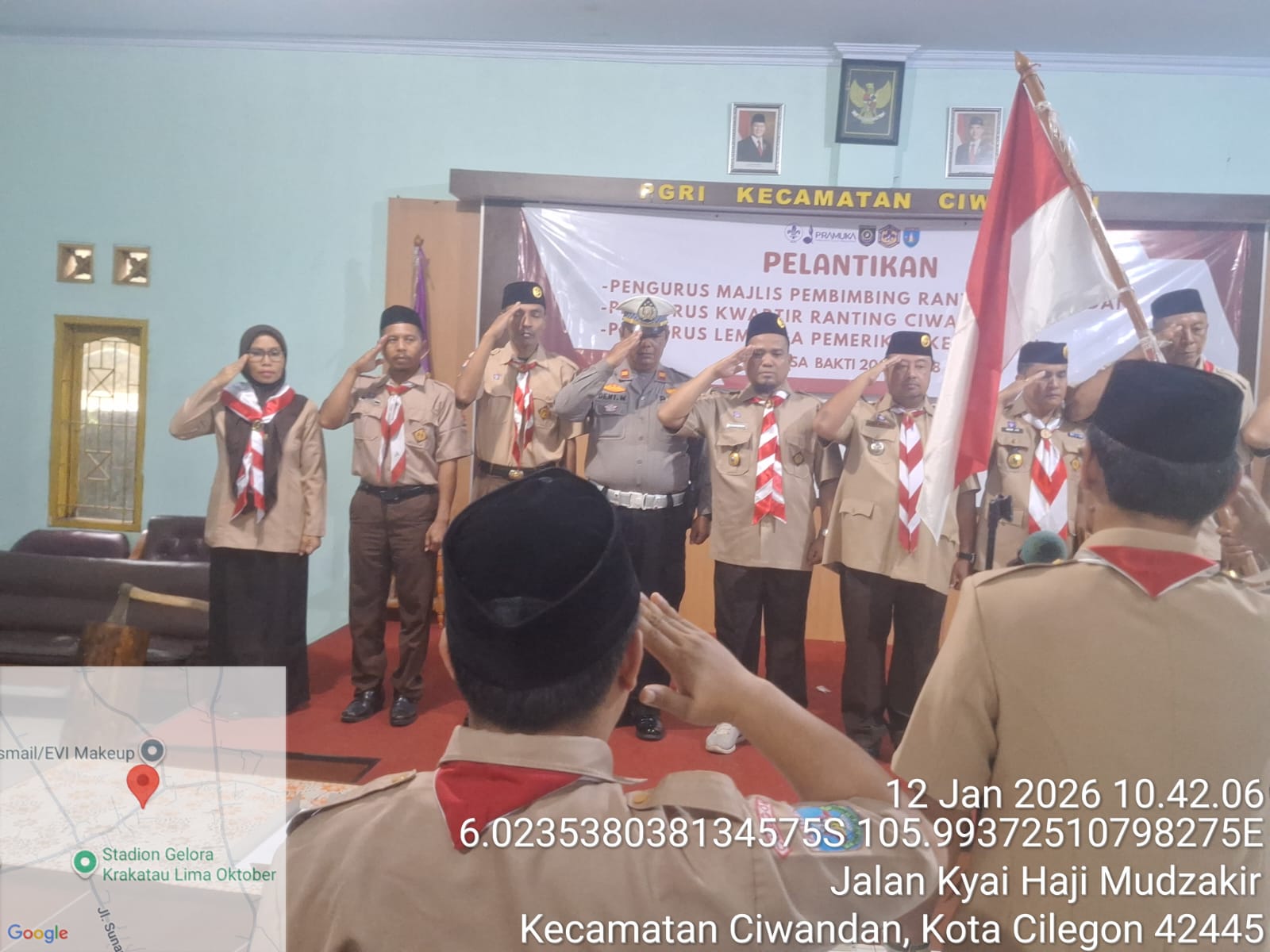 Cilegon - Polres Cilegon melalui Polsek Ciwandan menghadiri pelantikan pengurus Majlis Pembimbing Ranting Ciwandan, Pengurus Kwartir Ranting Ciwandan, dan Pengurus Lembaga Keuangan Masa Bakti 2025-2026 di Gedung PGRI Kecamatan Ciwandan. Senin (12/01/2026).