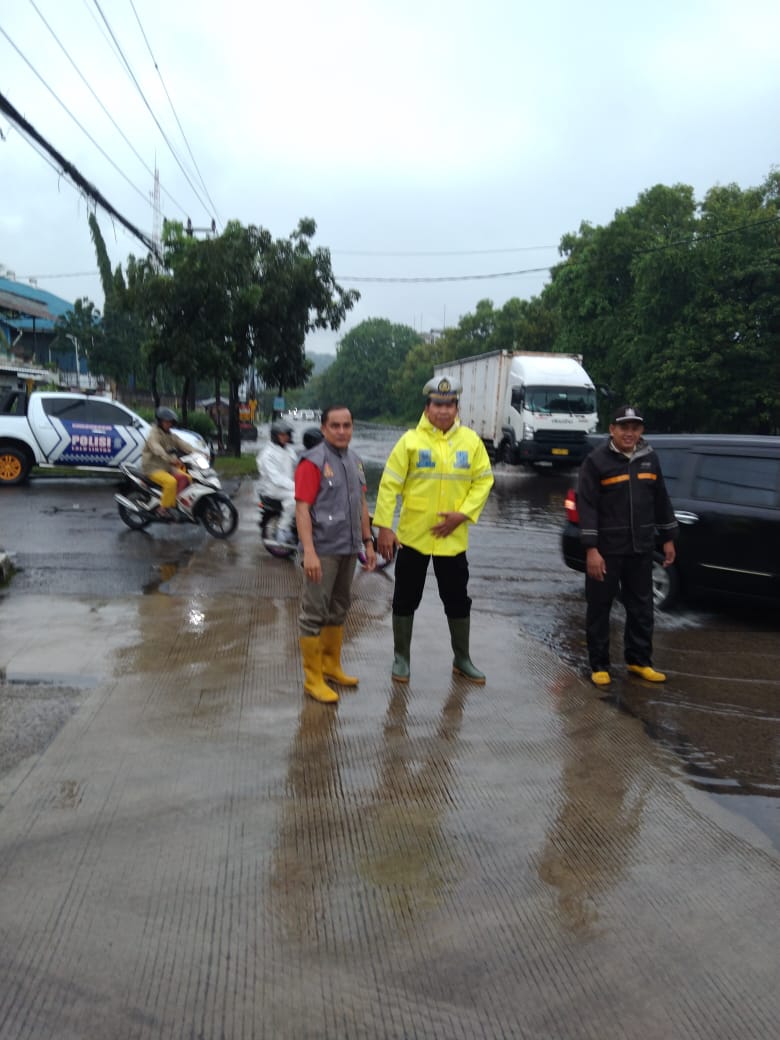 Personil Polsek Ciwandan Polres Cilegon Alihkan Arus Lalu-Lintas Dampak Dari Genangan Air