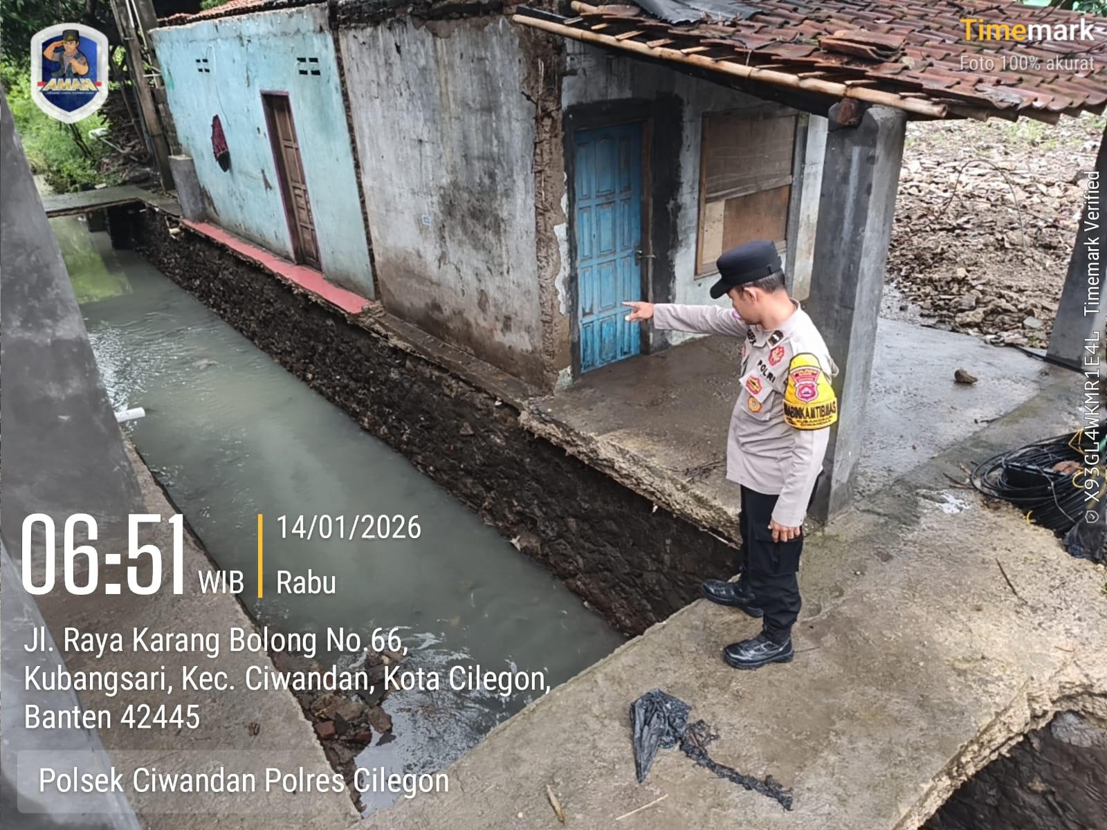 Cilegon - Dalam rangka antisipasi bencana alam personil Polsek ciwandan mengecek debit air di beberapa titik aliran sungai salah satunya yaitu kalimuk RT 005 RW 006 Kelurahan samang Raya Kecamatan citangkil Kota Cilegon, Rabu (14/01/2026).