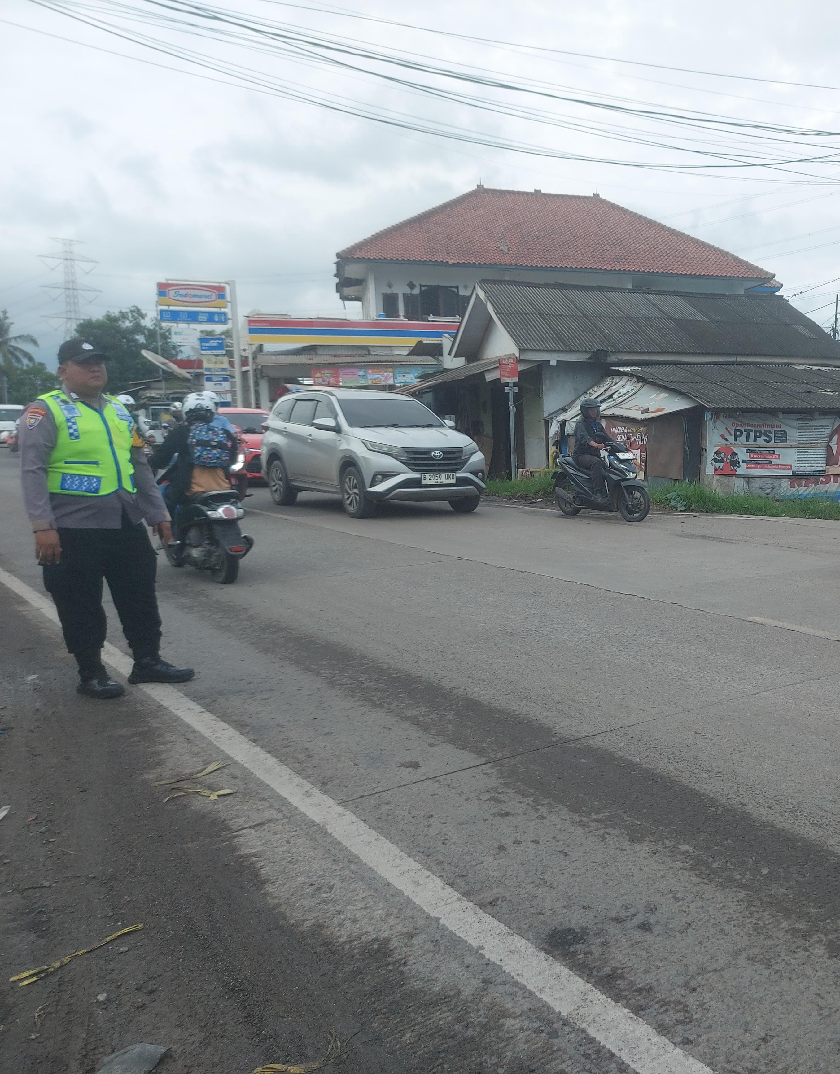 Bripka Tri Handoko dan Bripka Heru Bhabinkamtibmas Laksanakan Gatur Lalin Pagi hari Di Simpang Jalan Raya Wadas Bojonegara
