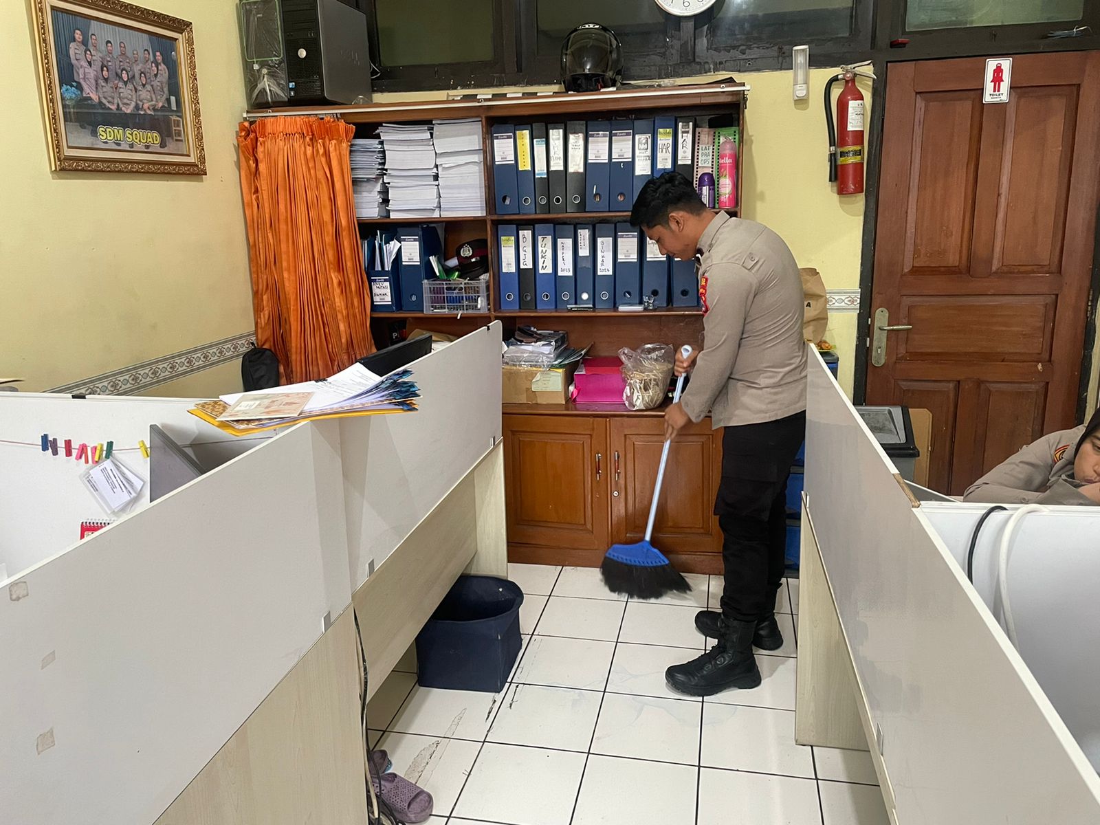 Anggota Bag SDM Polres Cilegon, Aktif dalam melaksankan kegiatan membbersihkan ruangan kerja secara rutin.