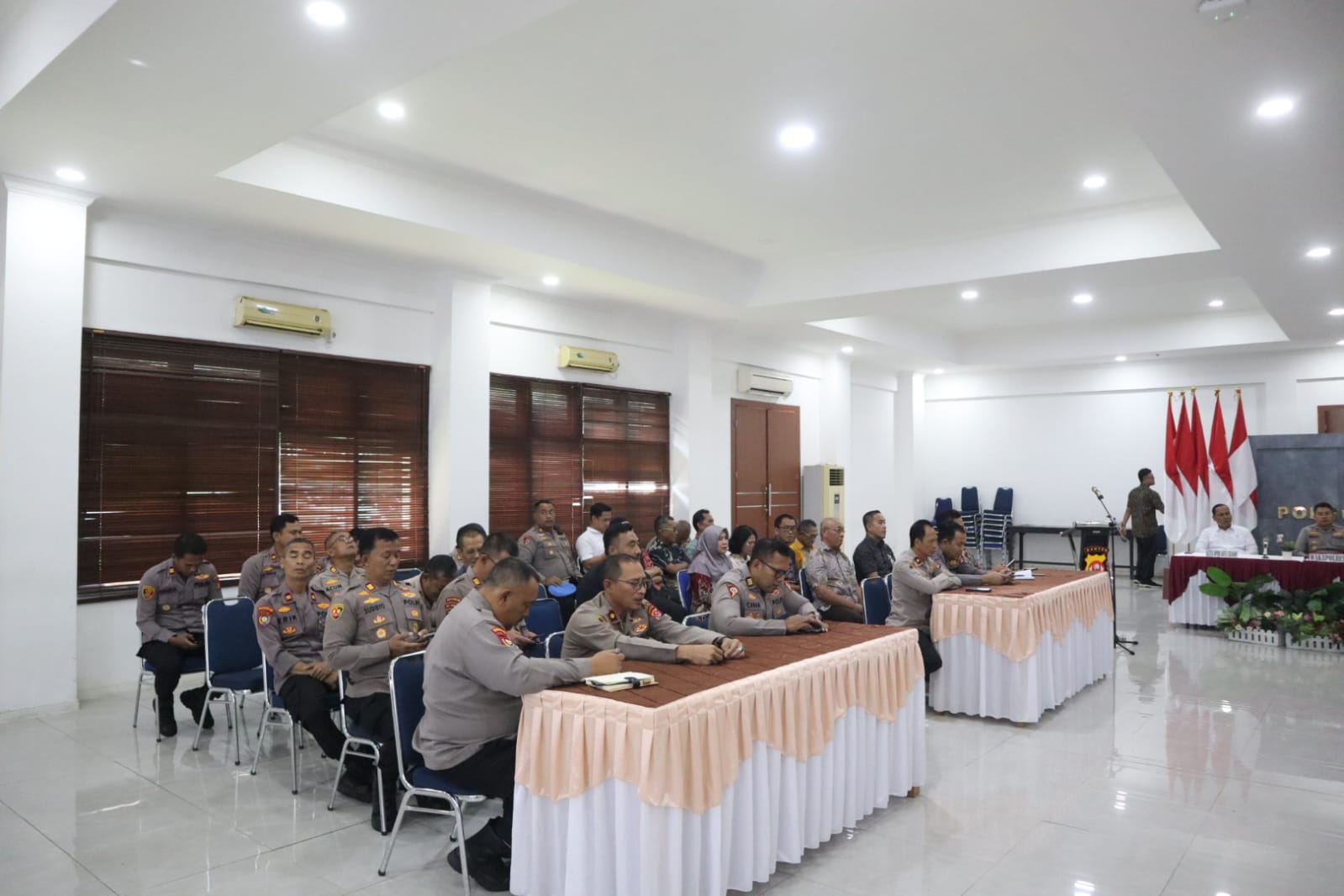 Rapat koordinasi dilaksanakan di bawah penanggung jawab Kapolres Cilegon AKBP Dr. Martua Raja Taripar Laut Silitonga, S.H., S.I.K., M.Si. Kegiatan turut dihadiri Wakapolres Cilegon KOMPOL M. Ridzky Salatun, S.I.K., Wakil Ketua I DPRD Kota Cilegon H. Sohidin, S.H., Wakil Ketua II DPRD Kota Cilegon H. Masduki, Asda II Kota Cilegon H. Dana Sujaksani, S.Sos., M.Si., Danramil Cilegon Mayor Inf Usman, Plt Kadis Ketahanan Pangan Kota Cilegon Novi Yogi, Sekjen MUI Kota Cilegon H. Sutisna Abas, Ketua MUI Kabupaten Serang H. Muhit, Ketua FKUB Kabupaten Serang KH. Komarudin, Head Operation ASDP Merak I Putu Widhiyatamaja, Jr Officer Sc PT Pertamina Tanjung Gerem Achtizen, para PJU Polres Cilegon, Kapolsek jajaran Polres Cilegon, perwakilan SKPD Kota Cilegon, pimpinan instansi terkait, serta pimpinan organisasi keagamaan.