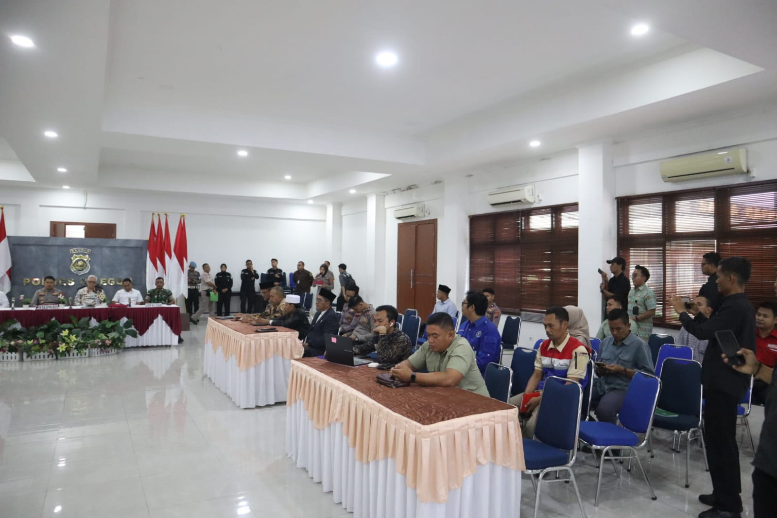 Rapat koordinasi dilaksanakan di bawah penanggung jawab Kapolres Cilegon AKBP Dr. Martua Raja Taripar Laut Silitonga, S.H., S.I.K., M.Si. Kegiatan turut dihadiri Wakapolres Cilegon KOMPOL M. Ridzky Salatun, S.I.K., Wakil Ketua I DPRD Kota Cilegon H. Sohidin, S.H., Wakil Ketua II DPRD Kota Cilegon H. Masduki, Asda II Kota Cilegon H. Dana Sujaksani, S.Sos., M.Si., Danramil Cilegon Mayor Inf Usman, Plt Kadis Ketahanan Pangan Kota Cilegon Novi Yogi, Sekjen MUI Kota Cilegon H. Sutisna Abas, Ketua MUI Kabupaten Serang H. Muhit, Ketua FKUB Kabupaten Serang KH. Komarudin, Head Operation ASDP Merak I Putu Widhiyatamaja, Jr Officer Sc PT Pertamina Tanjung Gerem Achtizen, para PJU Polres Cilegon, Kapolsek jajaran Polres Cilegon, perwakilan SKPD Kota Cilegon, pimpinan instansi terkait, serta pimpinan organisasi keagamaan.